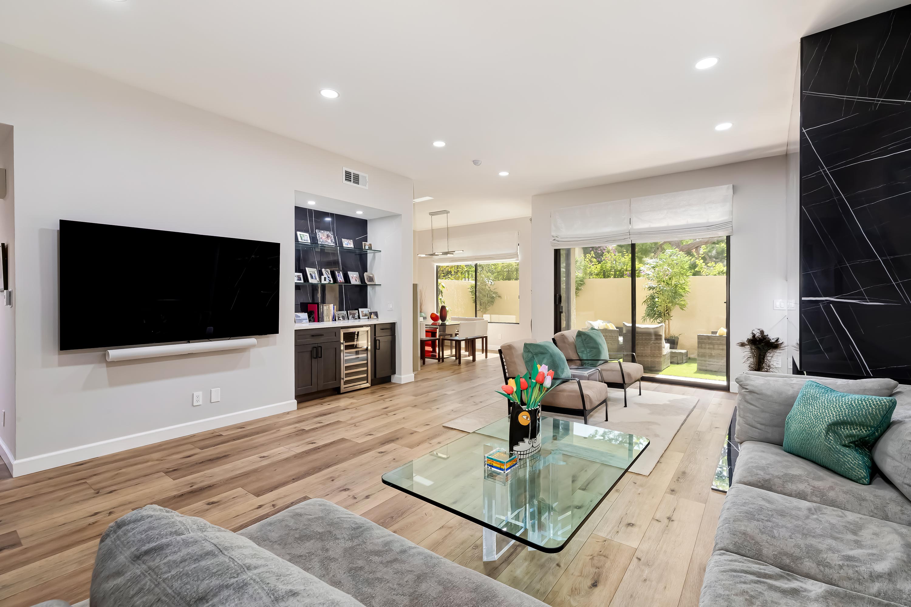 This stunning modern one-level main floor unit with southern and western exposure was extensively remodeled in 2021. Spacious open layout with super high ceilings, walls of glass, new flooring, new kitchen, new bathrooms, new lighting, new hardware, etc. Two large patios are accessed from the great room and both bedroom suites. Sizable kitchen with an abundance of cabinetry, quartz counters, and fantastic stainless appliances. Great room design flows to the western patio for ultimate indoor/outdoor entertaining. Primary suite is voluminous and features an amazing bath with dual floating vanity, freestanding architectural tub, huge shower, and big walk-in closet. 3 full-size parking spaces in the garage along with a separate storage unit. The parking space closest to the elevator is equipped with a new EV Charger. Century Hill illustrates a truly elegant and refined lifestyle in a most coveted guard-gated community with endless acres of beautifully manicured gardens, tennis courts, fitness center, multiple pools, and clubhouse.